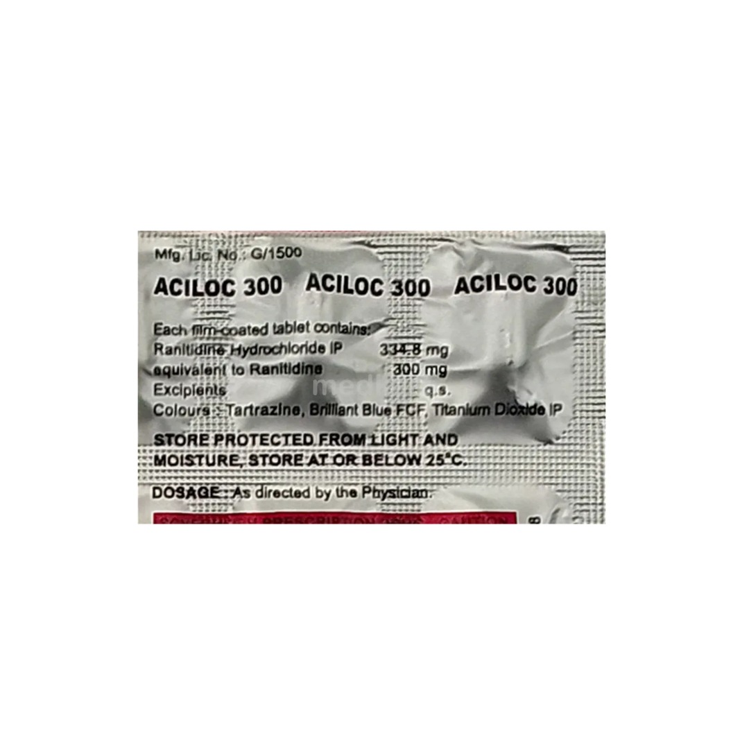 Aciloc 300 mg contains Ranitidine, which reduces excess acid secretion in the stomach. Used in acidity, heartburn, and gastric ulcer conditions.