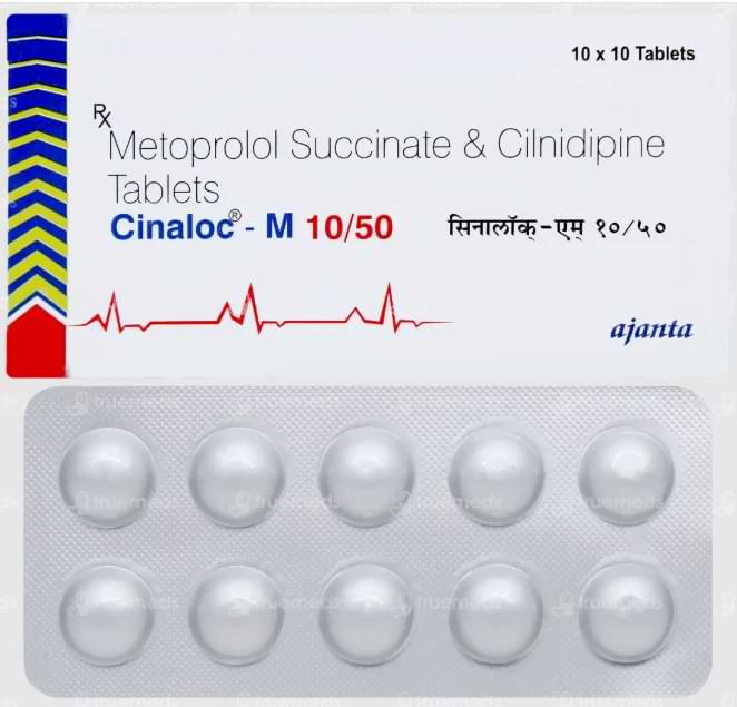 Cinaloc-M 10/50 mg is an antihypertensive medicine used for the treatment of hypertension (high blood pressure). It is a combination of two drugs: Cilnidipine 10 mg and Metoprolol Succinate 50 mg.
